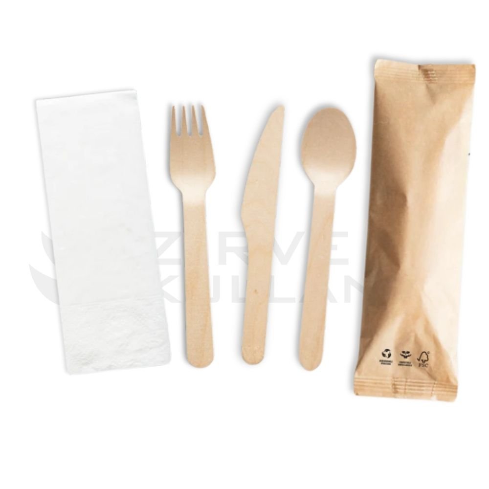 Kağıt jelatin ile kapalı set halinde satılmaktadır. Bambu tahta çatal bıçak kaşık seti, tek kullanımlık olup gıda ile temasa uygundur. Paket içeriği; bambu çatal, bambu bıçak, bambu kaşık ve peçete vardır. Restoranlar, kafeler, catering firmaları ve davetlerde yemek servisi için idealdir.