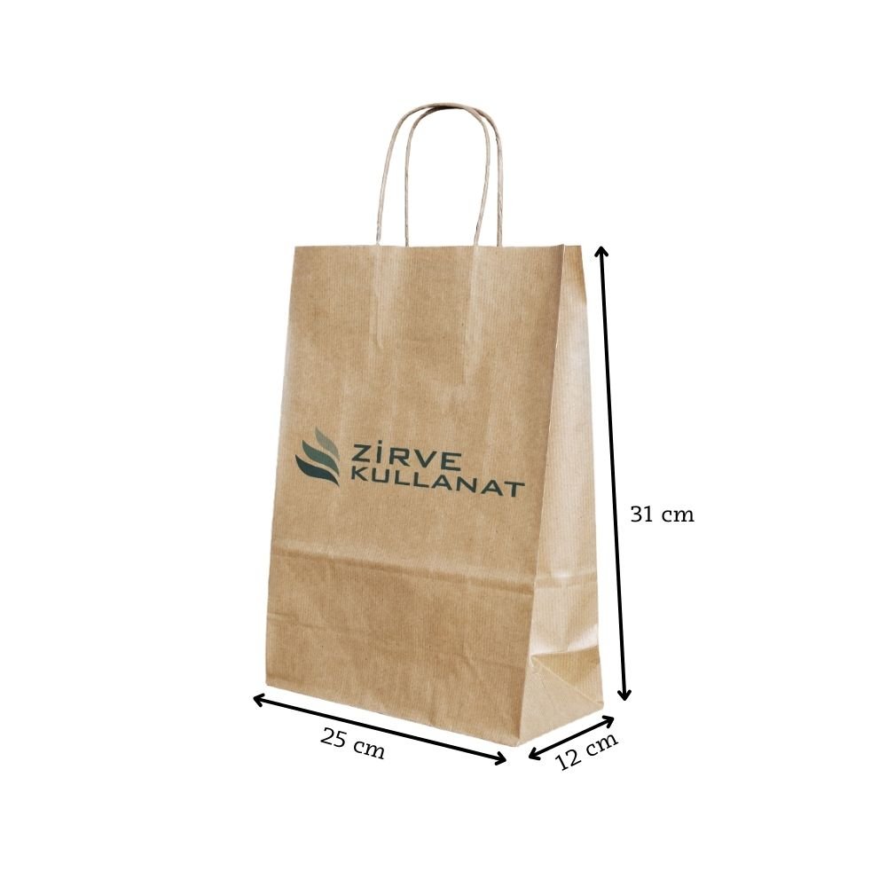 Burgu saplı kraft çanta, tutma kısmı büküm ip saplı kağıt çanta olup daha kaliteli bir görünüm ve rahat bir tutma hissi sağlamaktadır. 25 cm eninde, 31 cm boyunda, genişlik ise 12 cm’dir. Baskısız 80 gr kağıttan üretilmektedir.